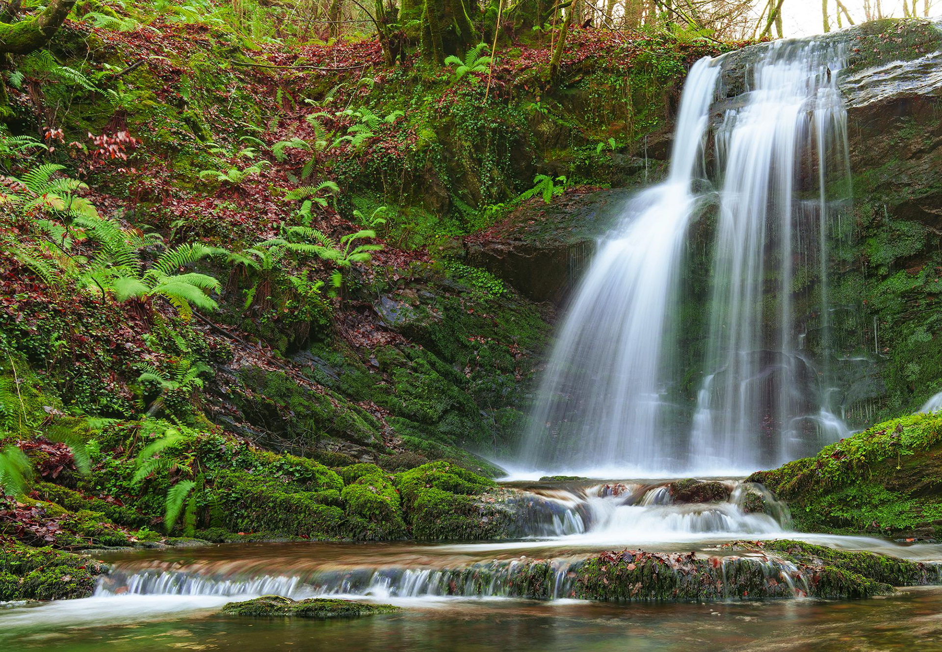 Hermosa cascada de Matxaingo ur-salto en Areso, Navarra. El agua fluye suave como seda entre rocas oscuras cubiertas de musgo verde. Un rincón natural, mágico, fresco y lleno de paz.